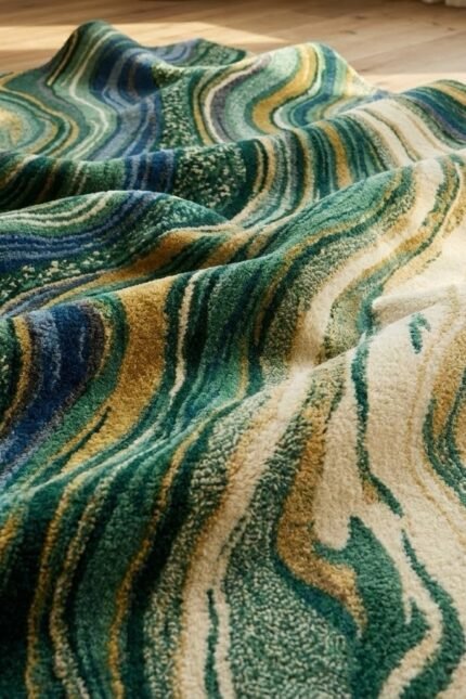 Inspired by the flowing layers of natural stone and ocean currents, Emerald Current features sweeping waves of emerald green, deep teal, sapphire blue, warm gold, and soft ivory. The dynamic marbled pattern creates a sense of depth and movement, making this carpet a striking centerpiece for modern living spaces, luxury bedrooms, and statement interiors. Its rich texture and vibrant tones bring both energy and elegance into any room.