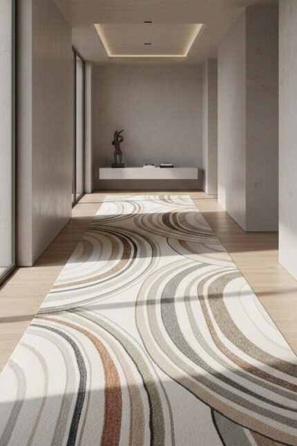 Halo Drift is a contemporary carpet inspired by flowing light and gentle motion. Its layered, curved patterns in warm neutrals and earthy tones create depth, balance, and a sense of calm — perfect for modern interiors.