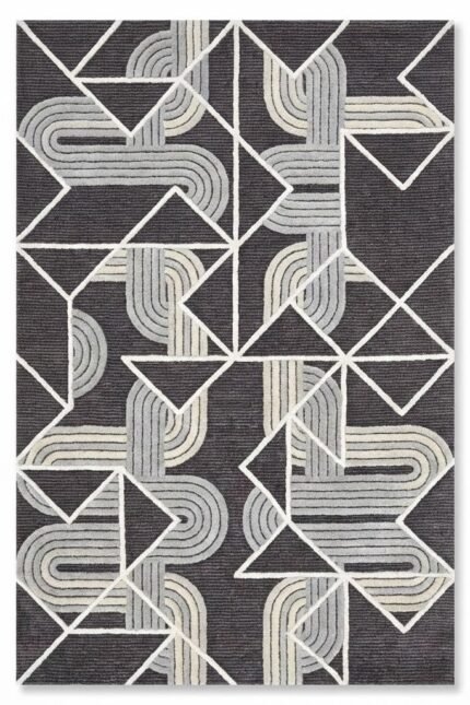 A bold expression of modern geometry, Rekha Noir combines crisp linear forms with flowing curved lines to create a striking visual rhythm. Set against a deep charcoal base, the layered ivory and grey patterns add contrast, movement, and architectural depth—making this carpet a perfect statement for contemporary living spaces, offices, and design-led interiors.