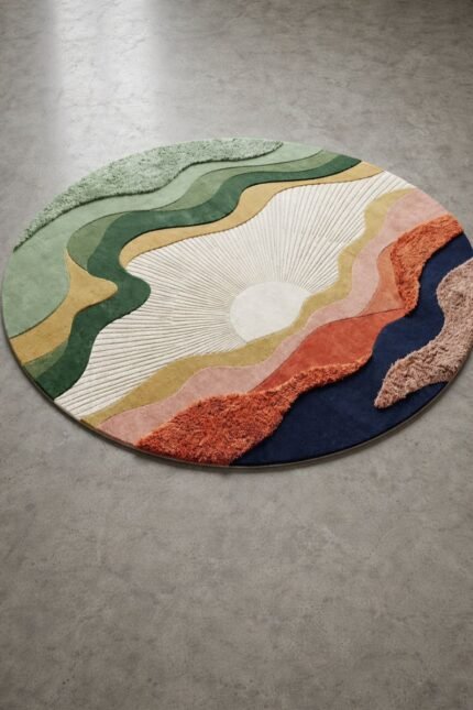 Horizon Disc is a bold, sculptural round carpet inspired by landscapes meeting the sky at dawn. Designed with flowing layered contours and a radiant sunburst center, this piece blends art and function into one striking floor statement. The combination of carved lines, raised textures, and earthy tones creates depth and movement, making it ideal for modern dining spaces, lounges, and cafes.