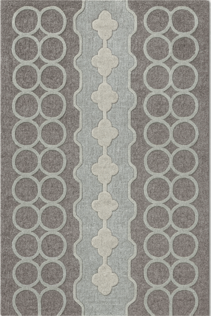 Symmetry Slate is a modern geometric carpet designed for contemporary, minimalist interiors. Featuring a rhythmic pattern of interlocking circles framed by a soft architectural center band, this design creates a calm, structured visual flow. The refined blend of slate grey, soft sage, and muted ivory brings a sophisticated neutrality that fits effortlessly into dining spaces.