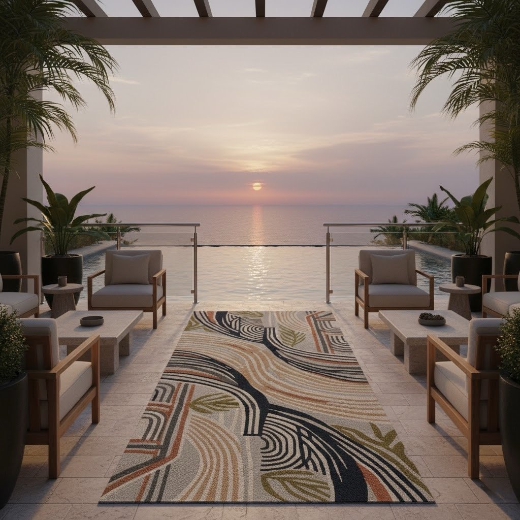 Crafted to withstand high-traffic use, Botanic Rhythm combines artistic expression with functional performance. The layered lines and subtle pile variation enhance depth and texture, offering a tactile experience that elevates both indoor and outdoor hospitality spaces.