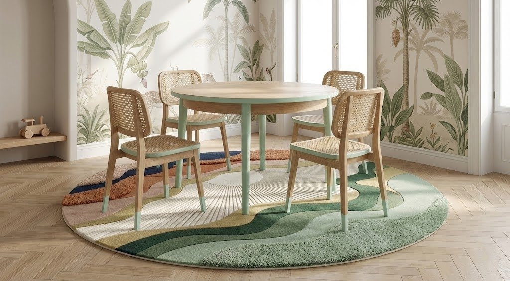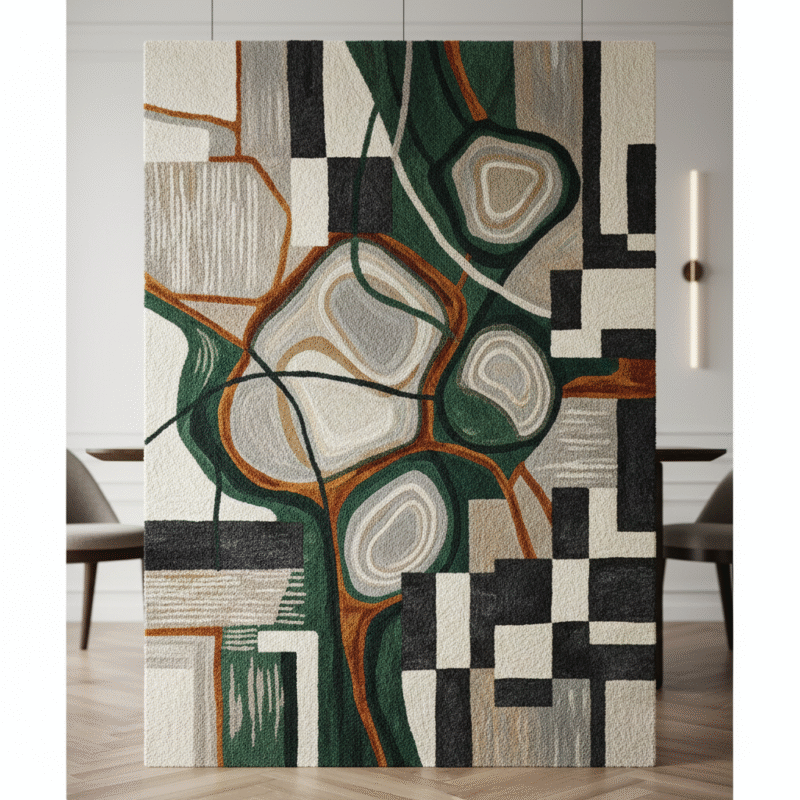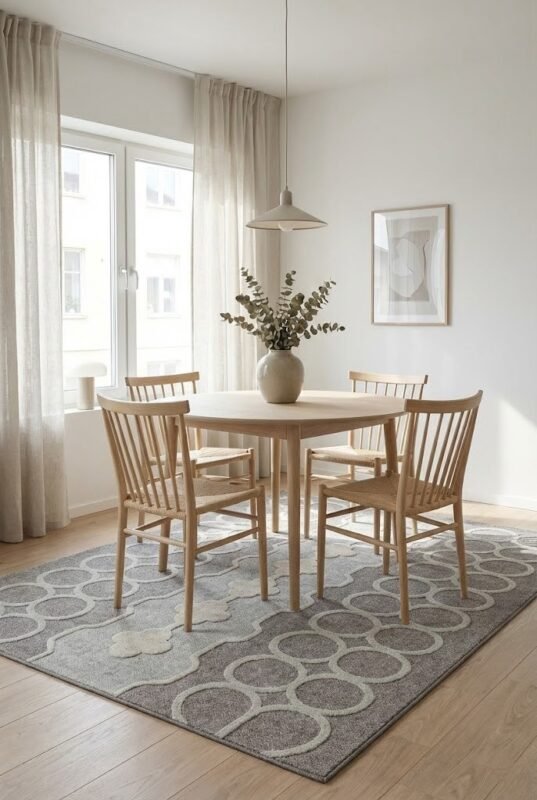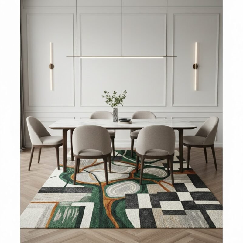Hand-tufted with precision by skilled artisans, this carpet offers a soft, luxurious feel underfoot while remaining practical for everyday dining use. The neutral palette blends effortlessly with wood, marble, or metal dining sets, making it a versatile choice for homes that value comfort and sophistication.