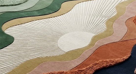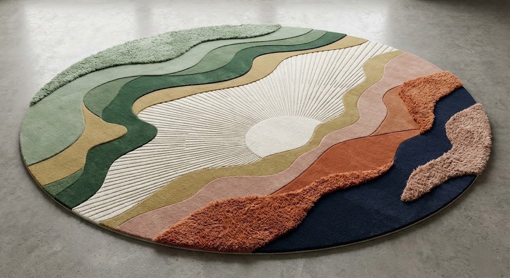 Horizon Disc is a bold, sculptural round carpet inspired by landscapes meeting the sky at dawn. Designed with flowing layered contours and a radiant sunburst center, this piece blends art and function into one striking floor statement. The combination of carved lines, raised textures, and earthy tones creates depth and movement, making it ideal for modern dining spaces, lounges, and cafes.