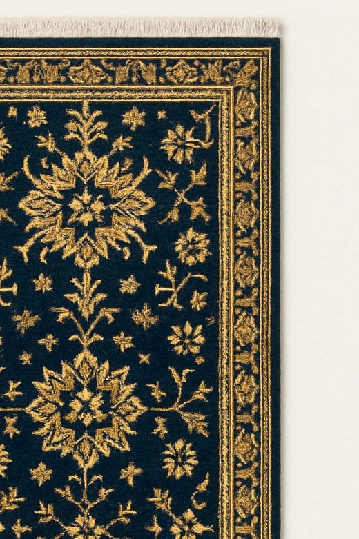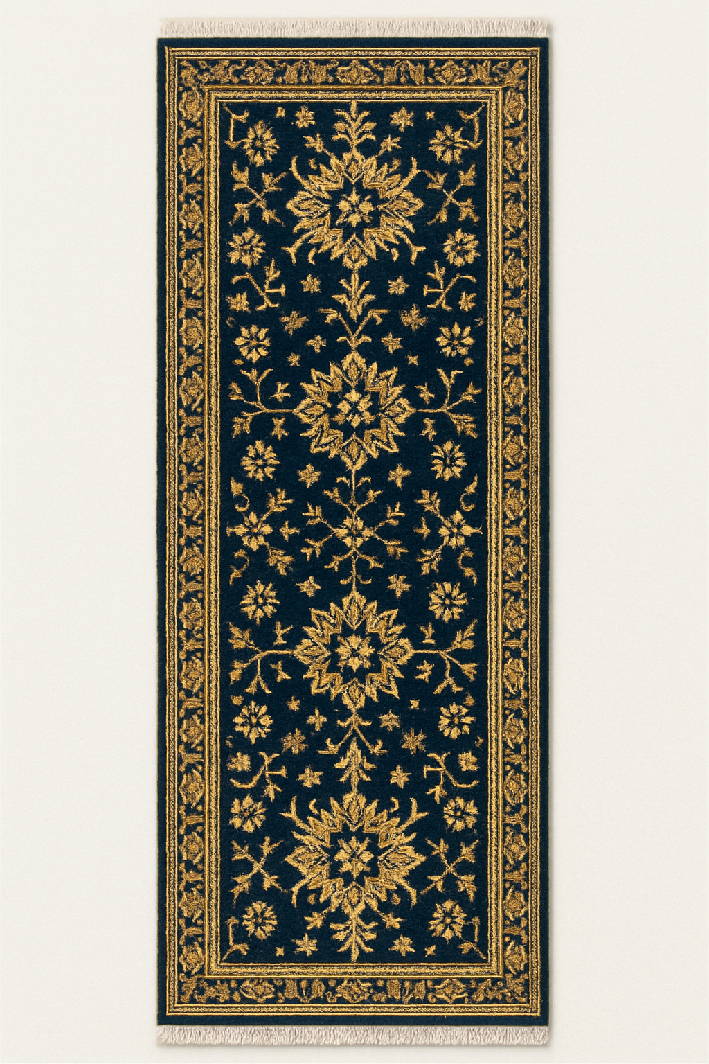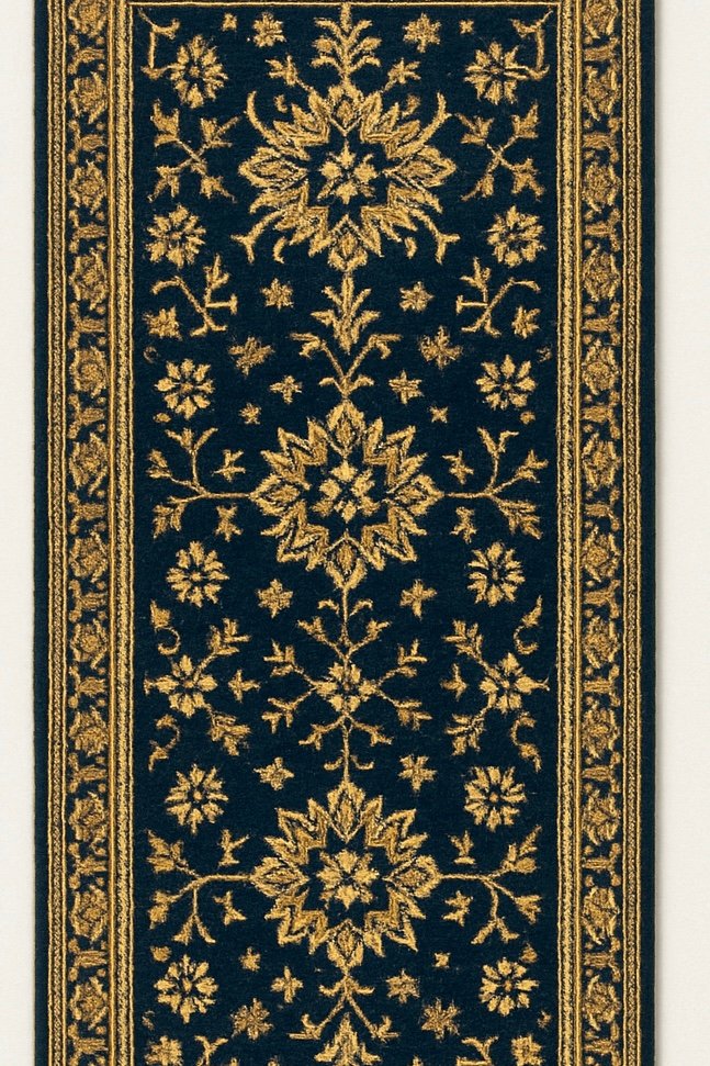 Imperial Midnight Runner is a regal, Persian-inspired runner designed to elevate grand corridors, foyers, and statement walkways. Set against a deep midnight-blue field, intricate gold floral medallions and vine motifs create a rich contrast that reflects timeless royal elegance. The finely detailed borders frame the design beautifully, giving the runner a formal, luxurious presence suited for heritage homes, boutique hotels, and palace-style interiors.