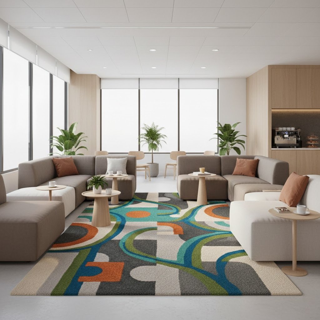 Interact is a contemporary hand-tufted carpet designed to energize corporate recreational and breakout spaces. The design brings together modular geometry, flowing lines, and bold circular accents, creating a visual dialogue that encourages movement, creativity, and collaboration. Balanced with refined neutrals and vibrant accent tones, Interact seamlessly bridges professional environments with relaxed, informal zones, making it ideal for modern offices, lounges, and collaborative hubs.