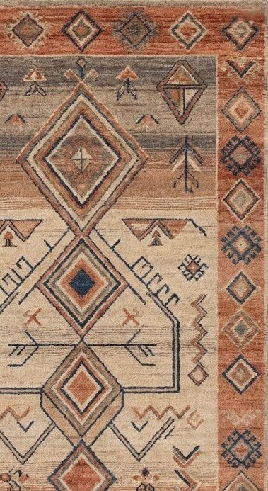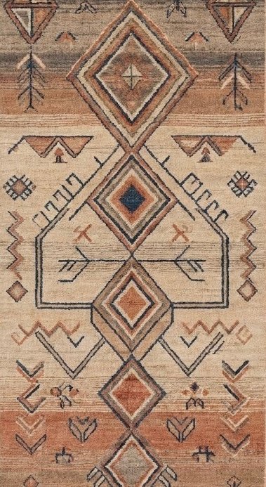 Kasbah Twilight is a contemporary tribal carpet inspired by the warm, dusky tones of North African kasbahs. Featuring layered diamond medallions, hand-drawn motifs, and earthy terracotta, sand, and charcoal hues, this design brings a grounded yet artistic presence to any interior. The balanced symmetry and handcrafted look make it ideal for modern and bohemian interiors.