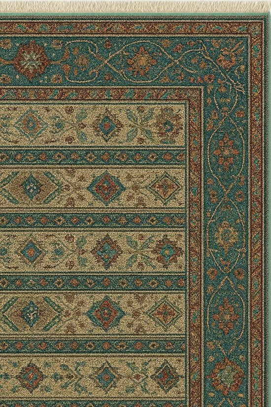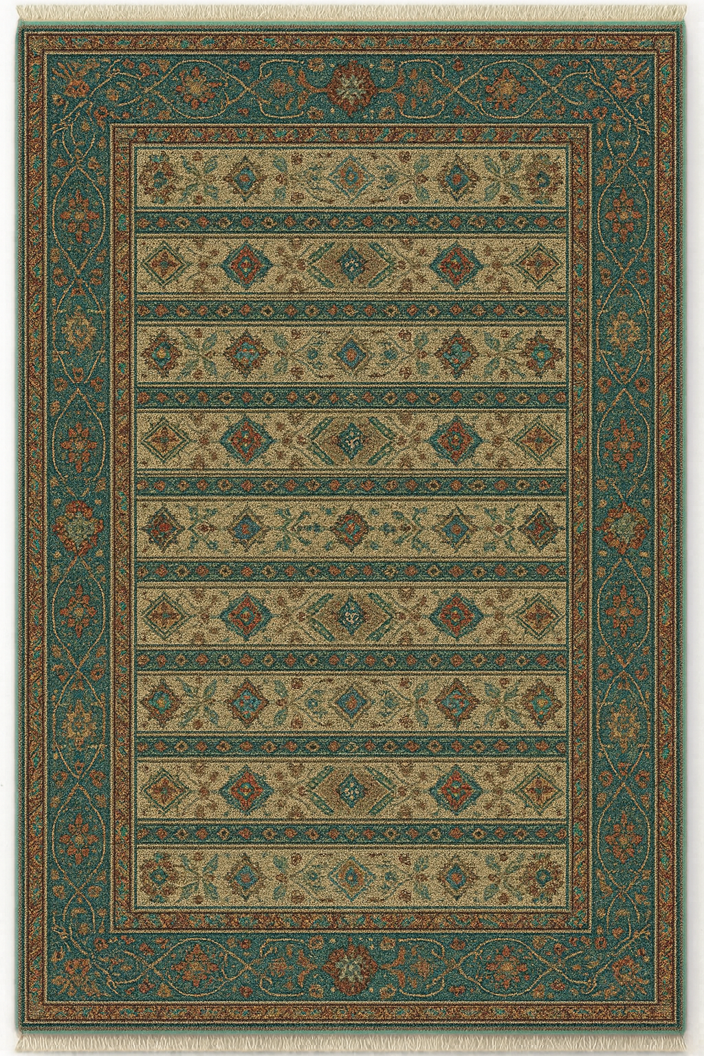 Kashgar Tribal Symphony is a rich, heritage-inspired carpet that draws from the ancient Silk Road patterns of Central Asia. Featuring layered horizontal bands of intricate diamond and floral motifs framed by a bold ornamental border, this design blends tradition with refined symmetry. The deep teal, muted gold, and rust accents create a luxurious yet grounded look, making it perfect for statement interiors, hospitality lounges, and upscale residential spaces.