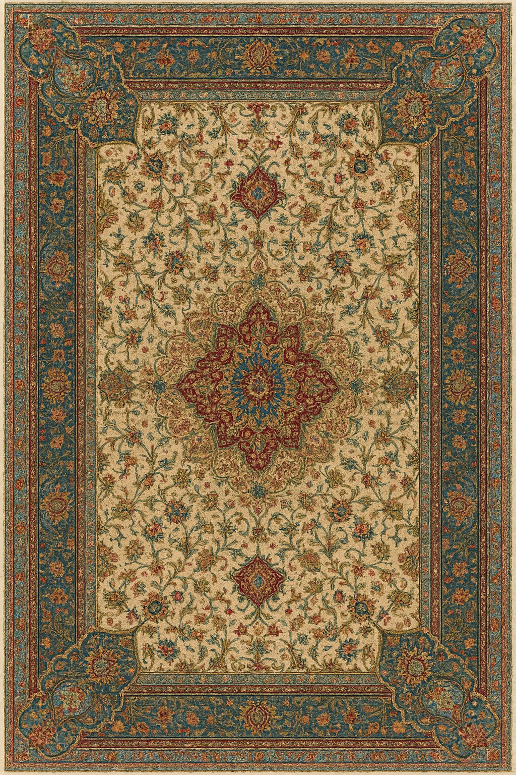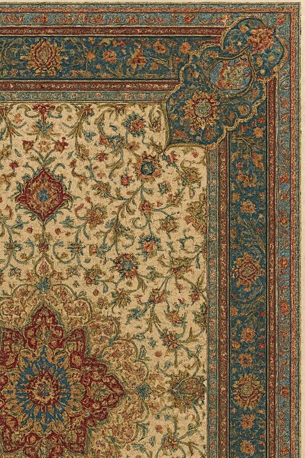Majestic Teal Court is a regal Persian-inspired carpet that brings classical luxury into refined modern interiors. Featuring an ornate central medallion surrounded by delicate floral vines and framed by an elegant teal court border, this design reflects the grandeur of royal palace carpets. The rich teal, ivory, and ruby accents create a timeless visual depth, making it ideal for statement living spaces, boutique hotels, and premium hospitality projects.