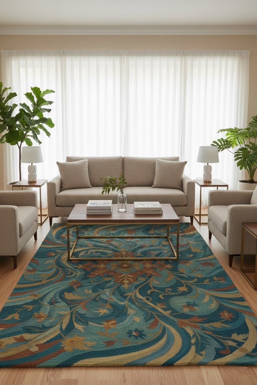 A striking fusion of classical elegance and contemporary depth, Midnight Garden features a dramatic floral medallion flowing through rich teal and midnight blue tones. Intricate vine and leaf motifs unfold across the surface, creating a sense of movement and layered luxury. Accents of warm gold and rust bring contrast and refinement, making this carpet ideal for statement living rooms.