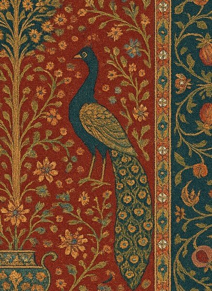 Royal Garden Cascade is an opulent heritage carpet inspired by the grand Mughal and Persian palace gardens. Featuring elegant peacocks flanking a flowering tree rising from a royal urn, this design symbolizes beauty, prosperity, and eternal growth. The rich ruby red field contrasted with deep teal borders and intricate floral vines creates a striking, museum-like presence, making this carpet a true statement piece for luxury interiors.