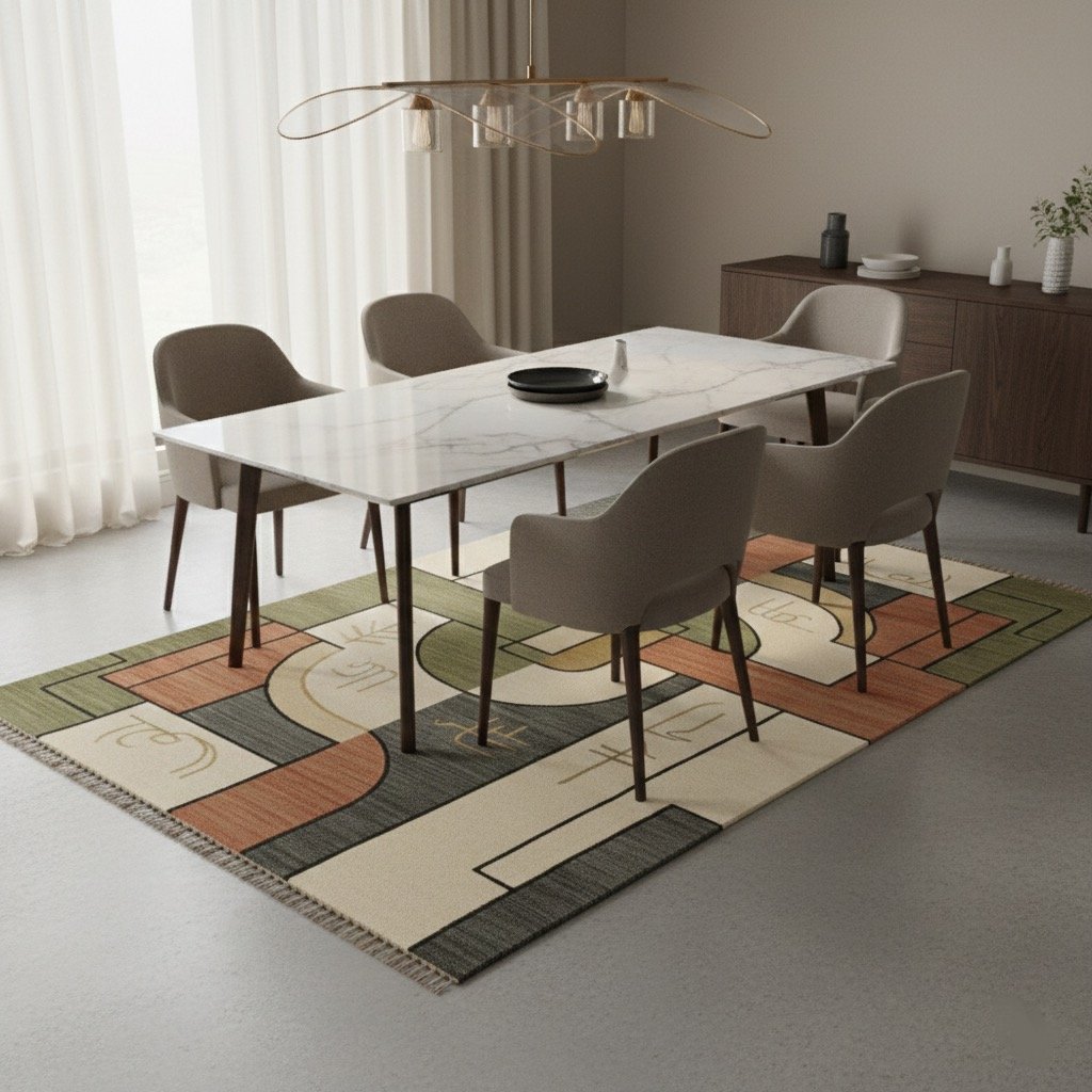 Hand-tufted with precision by skilled artisans, this carpet offers a soft, luxurious feel underfoot while remaining practical for everyday dining use. The neutral palette blends effortlessly with wood, marble, or metal dining sets, making it a versatile choice for homes that value comfort and sophistication.