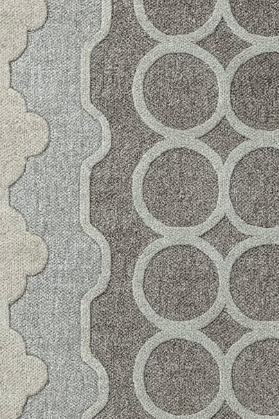 Symmetry Slate is a modern geometric carpet designed for contemporary, minimalist interiors. Featuring a rhythmic pattern of interlocking circles framed by a soft architectural center band, this design creates a calm, structured visual flow. The refined blend of slate grey, soft sage, and muted ivory brings a sophisticated neutrality that fits effortlessly into dining spaces.